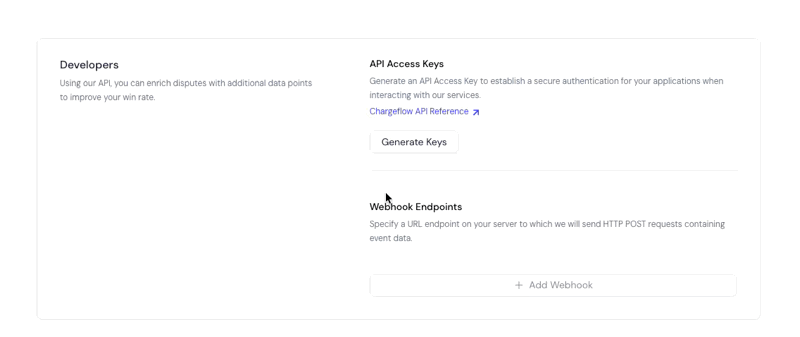 When integrating with Chargeflow, your application may need to receive real-time notifications for specific events, such as when a new dispute is created. Webhooks provide this capability by allowing you to register an HTTP endpoint that Chargeflow can call whenever a subscribed event occurs.