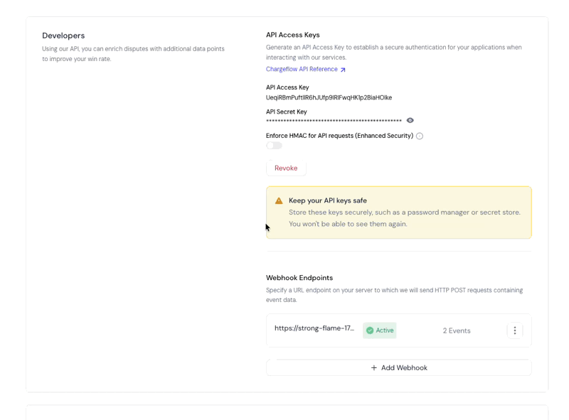 The Secret Key used to sign (and verify) the Webhook requests is available in the Chargeflow's Settings page together with other Webhooks configurations.