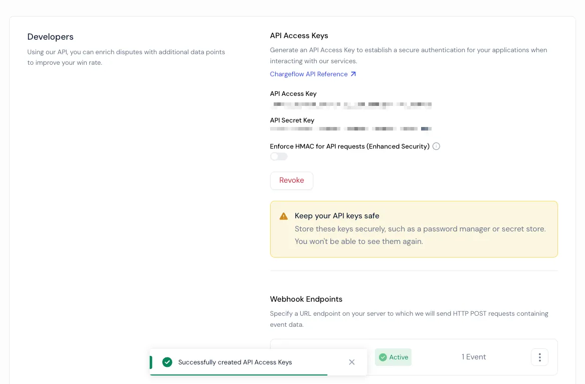 **Keep your API keys secure ** Your API keys provide access to your Chargeflow data. Store them safely and only share them with trusted parties